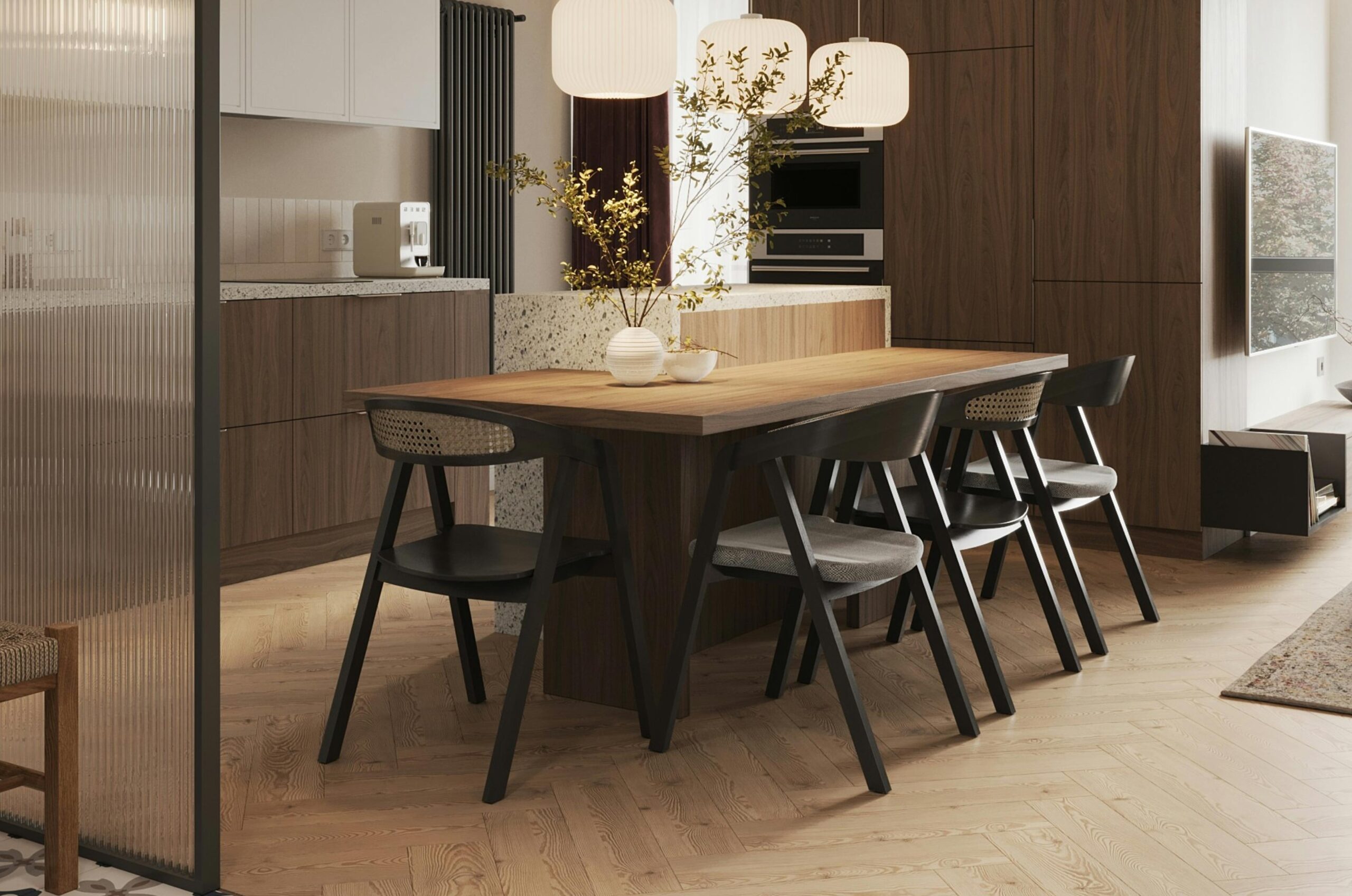 Natural textures, such as wood, stone, and woven materials, combined with rich, deep blue tones, create a harmonious flow that seamlessly connects the various spaces throughout the home. This thoughtful combination not only enhances visual continuity but also evokes a sense of calm and cohesion, making each room feel like an intentional extension of the next.